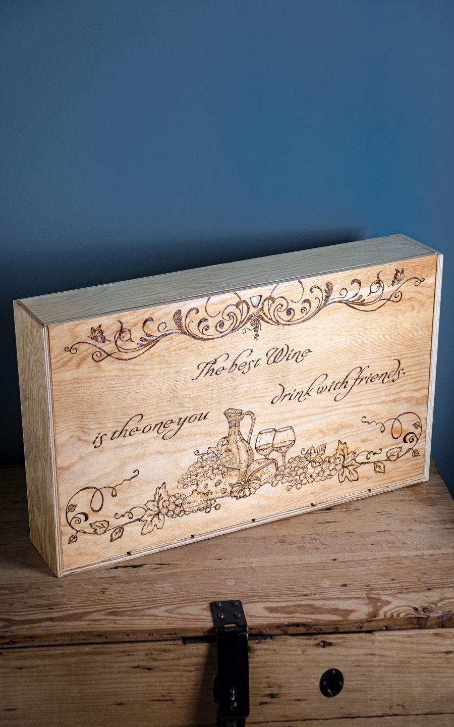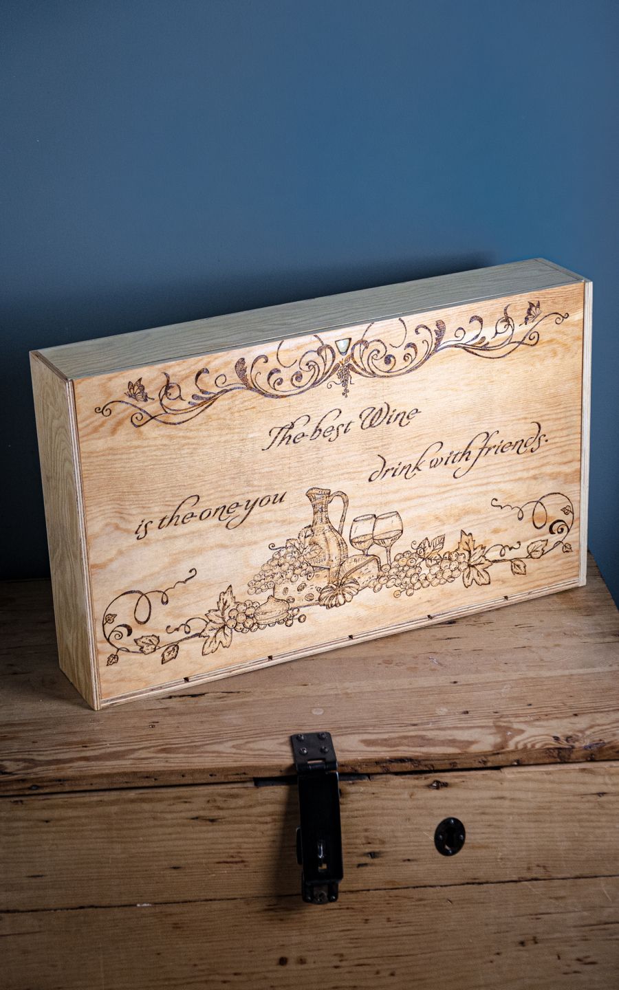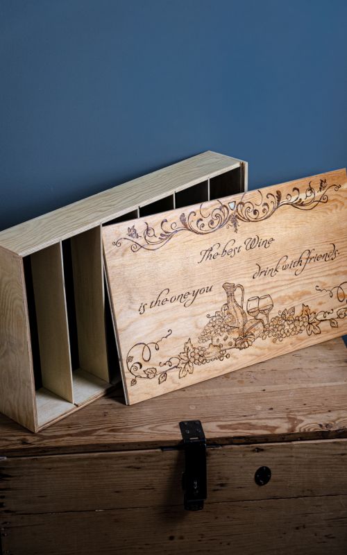 Indulge in a touch of elegance with our 6 Bottle Hand Burned Pre-Made Wine Box. A tasteful blend of rustic charm and style, this wine box gift is a sophisticated choice for any connoisseur. Showcasing superior craftsmanship, the hand-burned design offers a unique aesthetic, making it an exceptional wine gift box. The versatile design accommodates six standard-sized bottles, making it perfect for showcasing your chosen vintages. As a unique piece or among other wine gift boxes, its allure will charm any recipient, guaranteeing it to be the pièce de résistance of any social gathering.
