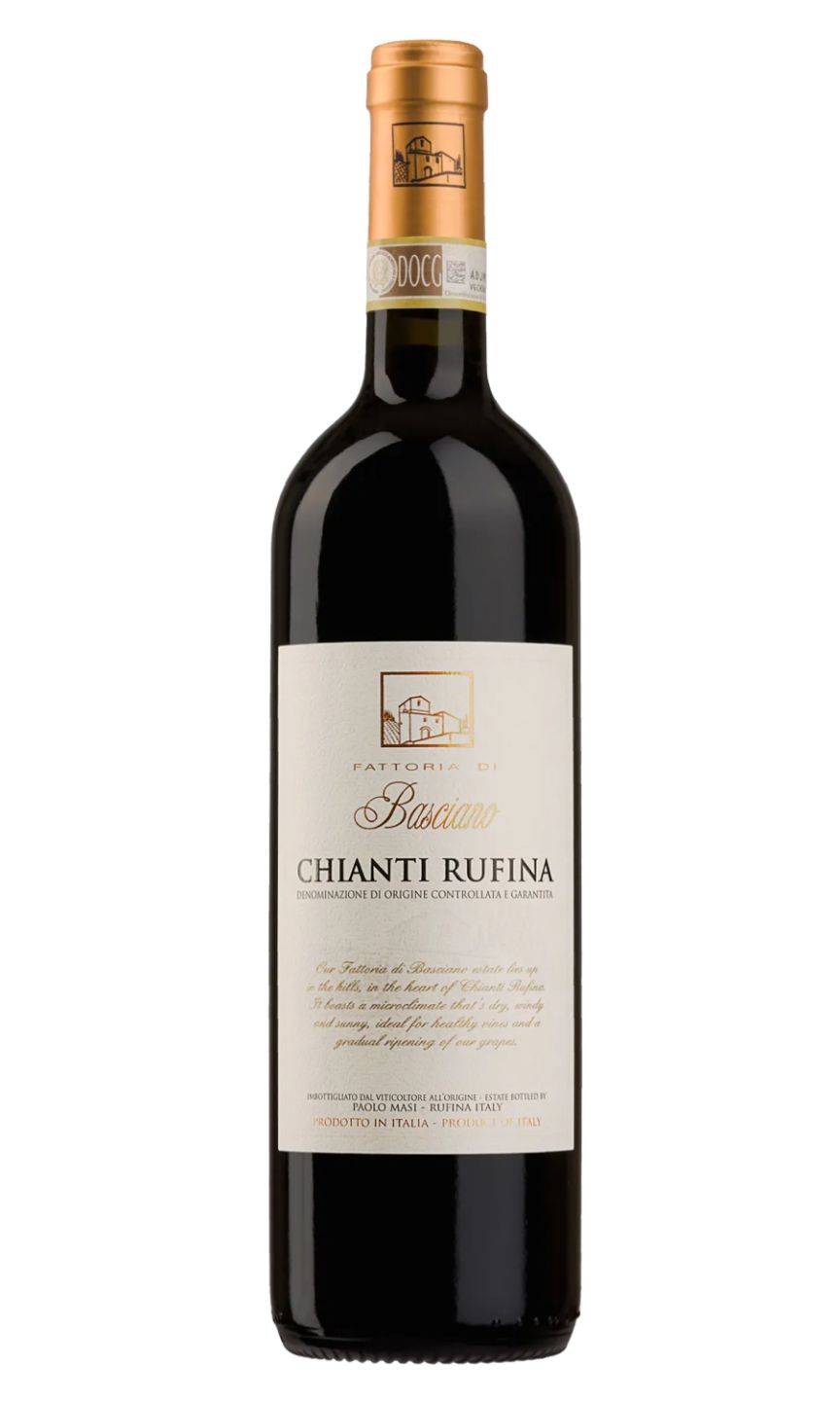 Fattoria di Basciano Chianti Rufina wine is a splendid embodiment of Italy's famed Tuscan region. This superior quality wine boasts a tantalising ruby-red hue, with a richly layered bouquet of ripe cherries, blackberries, and a hint of mocha. The palate is generously robust, expressing rounded tannins and a delightfully fresh acidity. Its intricate flavour profile reveals a harmonious blend of black fruit nuances and gentle spice, with a lingering finish that resonates with rustic Italian authenticity. A decadent representation of the Sangiovese grape, this Chianti Rufina is simply a must-try for any wine enthusiast.
