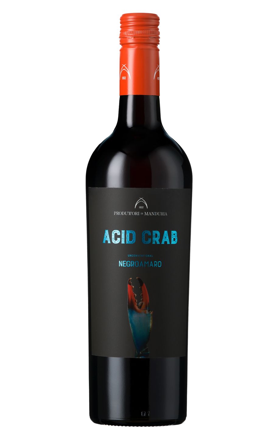 Produttori Di Manduria Acid Crab Negroamaro is a full-bodied Italian red wine from Puglia, the heel of Italy's boot. It boasts a profoundly aromatic nose showcasing hints of ripe red fruits, spices and subtle earthy tones. The palate is robust, expressing a compelling mix of raspberry and blackberry notes with a definitive undercurrent of spice. Given its firm tannins and rivetingly complex character, this wine stands up beautifully to hearty cuisines. Enjoy the nuanced flavours and smooth finish of Produttori Di Manduria Acid Crab Negroamaro, an emblem of Puglian oenological excellence. A true connoisseur's delight, full of Southern Italy's charm and zest.